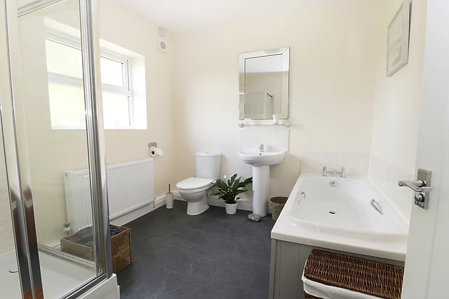 A separate family bathroom includes a bath with a shower over. The L-shaped kitchen is well-equipped with an electric oven, hob, microwave, fridge/freezer, dishwasher, and washing machine.
