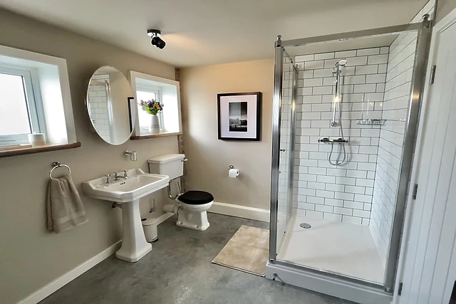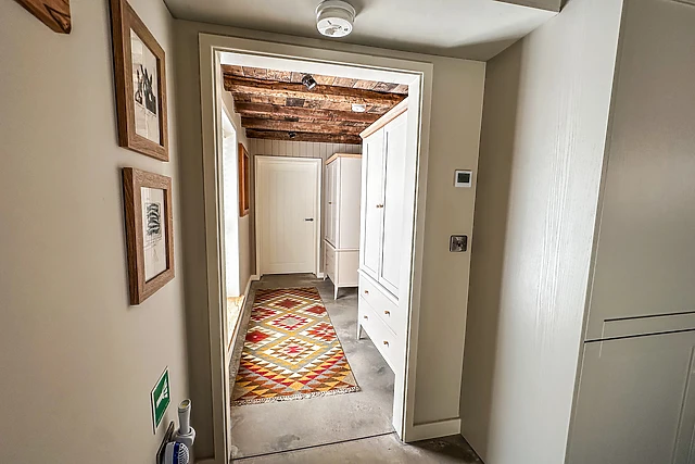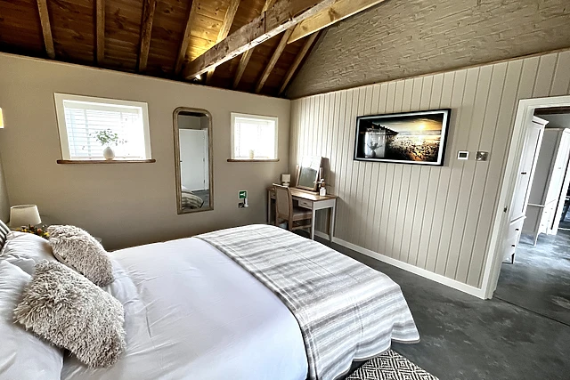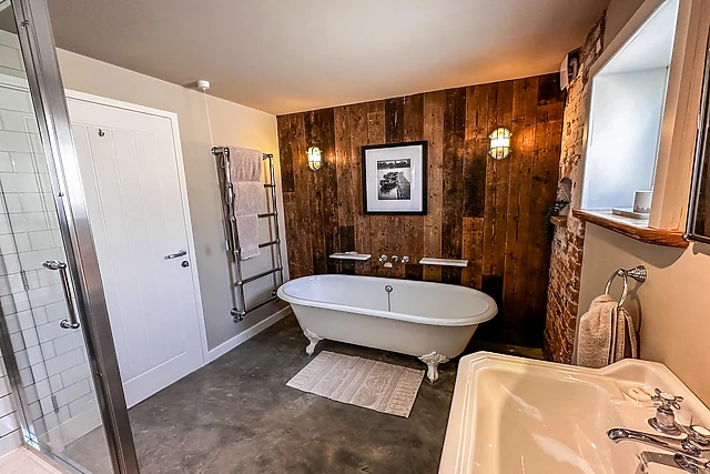 The spacious hallway leading to the bedroom houses two double wardrobes.The bedroom includes a king size bed, a wall-mounted Samsung 'frame' Smart television, and a vaulted ceiling. The bathroom oozes character and charm, with a traditional cast iron bath and a separate shower enclosure.