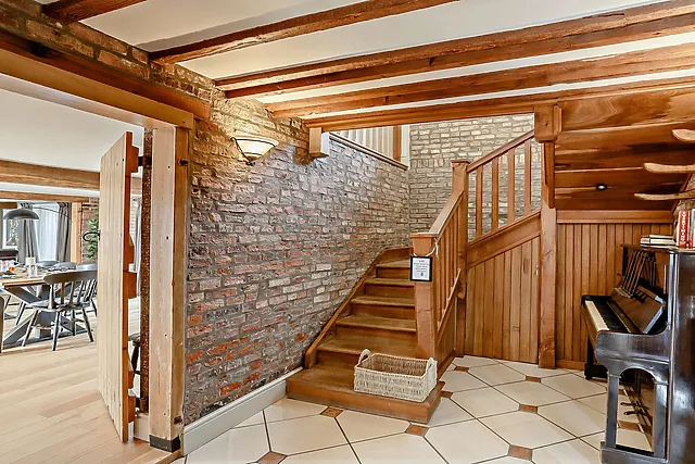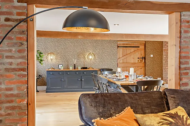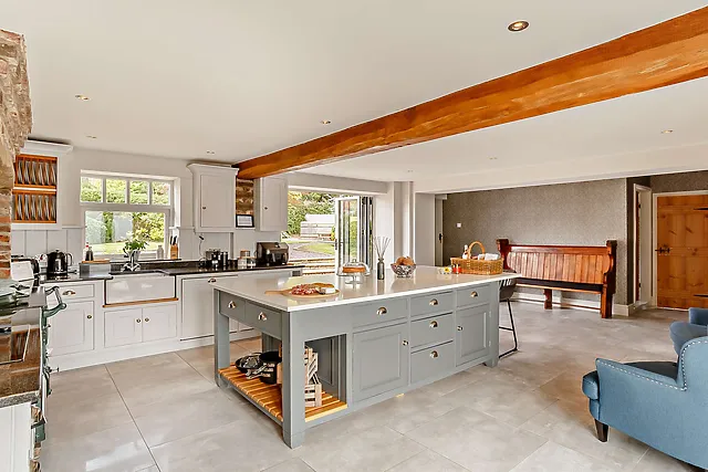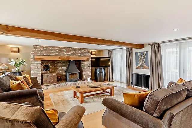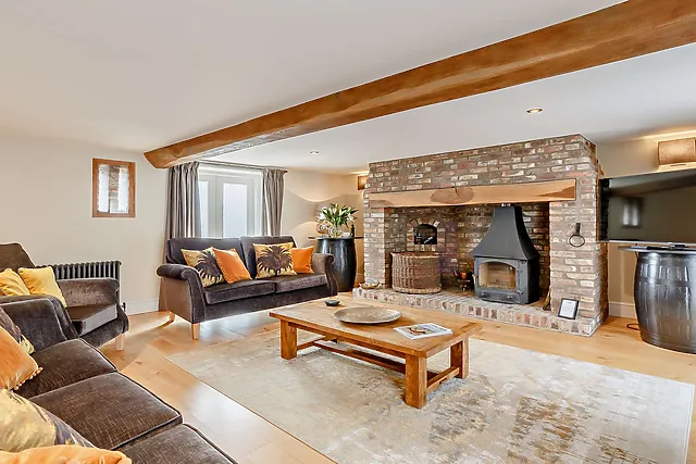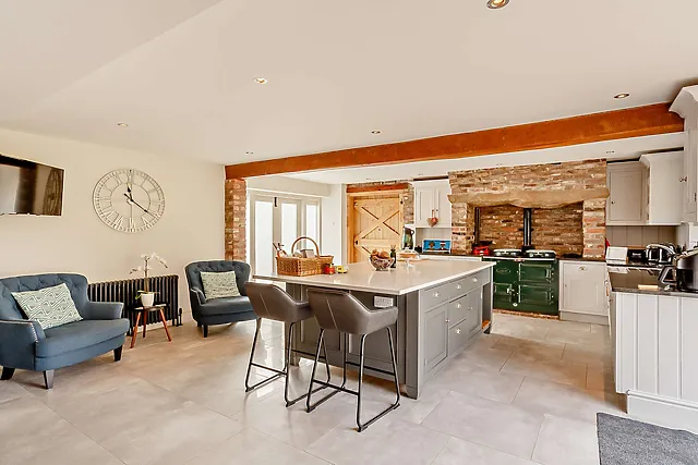 Step inside to discover a bespoke kitchen with a grand island, perfect for socialising, and an open-plan lounge/diner with a cosy wood burner.