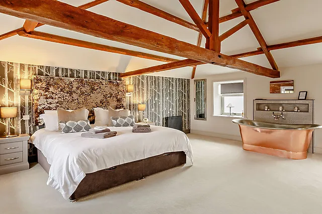 The master bedroom is a sanctuary featuring a copper roll-top bath, ensuring relaxation is at the heart of your stay.