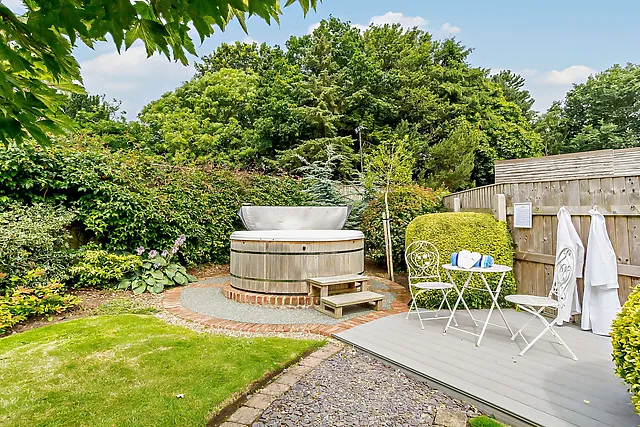 Outside, the fully enclosed garden offers a tranquil setting with a patio, stylish furniture, and a BBQ for al fresco dining. The highlight is undoubtedly the private hot tub, inviting you to unwind under the stars.