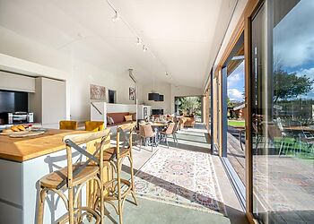 if you wish to dine alfresco, take your pick of outdoor tables – one on the front patio looking across open fields or an enclosed patio out the back. here, you’ll also find a reclining chair, bbq and hot tub to relax after a day’s adventuring. the lodge is half of a complex (larger parties can book both properties), which share a year-round tennis court and retro games room, perfect for kids big and small to let off steam!