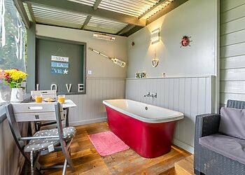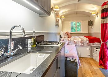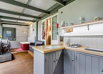 these charming shepherds’ huts provide a cosy haven for two, offering a king-size bed, a love seat, and a small indoor kitchen. enjoy the warmth of a powerful wood burner and the comfort of an electric blanket, with extra blankets and hot water bottles provided for chilly nights. a fully equipped covered, outdoor kitchen and a small indoor kitchen ensure you have everything needed for a delightful culinary experience. the fully decked veranda, complete with roll-down screens and a luxurious outdoor bath, allows for year-round enjoyment. the private garden area features a wood-fired hot tub, outdoor seating, and a fire pit with a bbq grill.