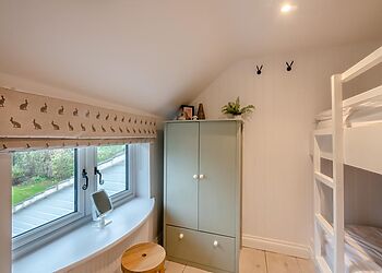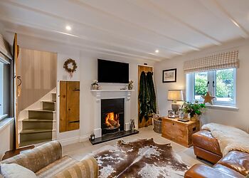 inside, the stylish lounge features a stone floor, rustic wooden doors, exposed beams, and a calming neutral palette, creating a cosy atmosphere to relax with loved ones. sink into the plush seating around the open fire, put your feet up after a day of exploring and settle in for a movie night on the smart tv. the well-appointed kitchen comes fully equipped for all your culinary needs, then enjoy your creations in the light-filled dining area. also on this floor is a stylish family bathroom. venture up the characterful cottage staircase to find two inviting bedrooms. the king-size bedroom promises restful nights with its soft hues and elegant furnishings. the second bedroom has bunk beds that children are sure to adore. french doors open from the dining area to a wraparound garden, where you’ll find a stylish lounge set. fire up the bbq for an al fresco feast, and let children and pets roam free on the expansive lawn. for a touch of indulgence, unwind in the private four-person hot tub. the front garden charms with its gravel paths and raised flower beds, with private parking for one car available.