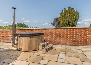 step outside onto the beautifully paved patio, adorned with feature lighting, and take in the breath taking panoramic views of the countryside. relax and unwind in the wood-fired hot tub or gather around the table and chairs for a delightful outdoor dining experience. for some outdoor fun, head over to the summerhouse and engage in ball games on the lush green grass. with 9 acres of woodland surrounding you, feel free to explore and immerse yourself in nature's beauty.