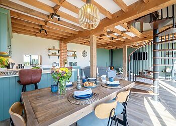 from the living space, glass doors slide open and lead to a sun-soaked patio area which features a well-equipped bbq and outdoor dining furniture perfect for al fresco meals at any time of day. sink into the patio’s soft seating with your holiday read or simply take in the tranquil rural views. guests are invited to explore the wider, shared grounds, or make full use of the on-site spa facilities for total relaxation. off-road parking is available for two cars.