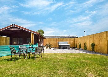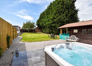 this home has a charming cottage feel to it, with gorgeous dark ceiling beams and stylish rustic-inspired furniture. in the cosy lounge, a large brick fireplace (although not functioning) creates a traditional look, while sofas and a smart tv are on hand for relaxing nights in. the dark beams and exposed brick continue into the kitchen-diner, a gorgeous, light-filled space with a farmhouse-style kitchen area and a circular table for enjoying meals together. a little further on, an outdoor-indoor space creates another spot for kicking back, with an egg chair for dreamy lounging. outside, you’ll have a lovely mature garden with flowers and lawn space – not to mention a large covered hot tub for six with led lighting.