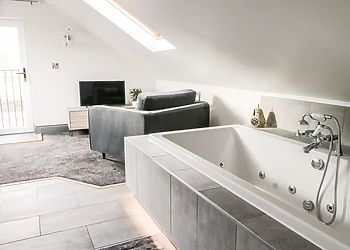 Apple Barn in Fylingdales, Yorkshire, is a stylish barn conversion that sleeps six people. This spacious cottage features three en-suite bedrooms, a modern open-plan living area, and a luxurious 6-seater hot tub. Located just 1 mile from Robin Hood’s Bay and less than 6 miles from Whitby, it’s perfect for exploring the local area.