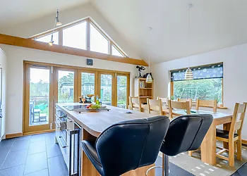 step into this warm and inviting home offering a haven for friends and families seeking a retreat. enter the property into a small porch where you can hang up your coats. next is the kitchen which is perfect for preparing a family dinner in this generously equipped kitchen with all you will need to rustle up a bite to eat with local produce purchased on your travels. the open-plan living area incorporates the lounge/diner. the delightful and welcoming lounge area features a comfortable sofa where you can unwind and watch your favourite movie on the smart tv or listen to music on the bluetooth speaker and enjoy the views. on chilly evenings, cosy up in front of the wood burner after a day spent exploring the beautiful surroundings, set the dining table and enjoy a home-cooked meal whilst planning your holiday activities. once finished remove the top and uncover a hidden pool table, perfect for a fun family evening. the sunroom is the perfect spot to enjoy your morning coffee and soak up the views. off the main hallway, you will find the family bathroom and the four bedrooms; two king-size with en-suite shower rooms and two twin rooms, one of the twin rooms has a single trundle bed that can sleep an extra guest. there's also a further shower room with a wetroom style shower and wc.